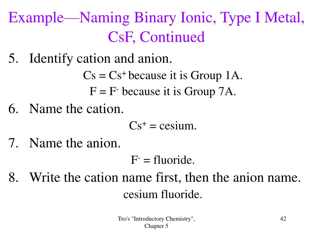Type I Binary Ionic Compounds • Contain metal cation + nonmetal anion. • Metal listed first in formula and name. • Name metal cation first, name nonmetal anion second. • Cation name is the metal name. • Nonmetal anion named by changing the ending on the nonmetal name to –ide. Tro's "Introductory Chemistry", Chapter 5