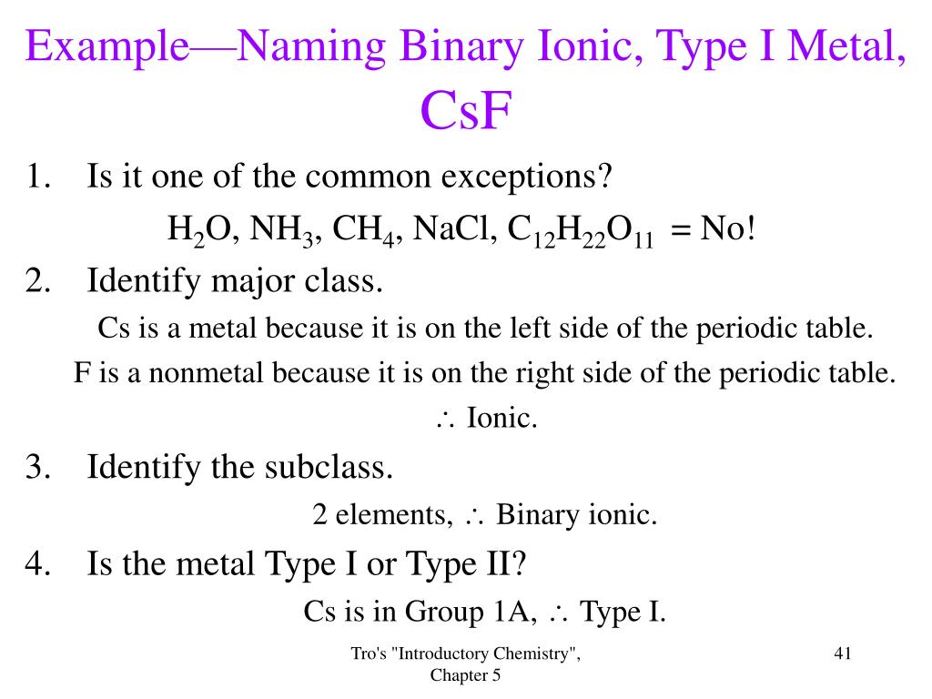 Example—Naming Binary Ionic, Type I Metal,CsF • Is it one of the common exceptions? H2O, NH3, CH4, NaCl, C12H22O11 = No! • Identify major class. Cs is a metal because it is on the left side of the periodic table. F is a nonmetal because it is on the right side of the periodic table. Ionic. • Identify the subclass. 2 elements, Binary ionic. • Is the metal Type I or Type II? Cs is in Group 1A, Type I. Tro's "Introductory Chemistry", Chapter 5