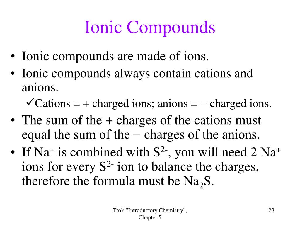 Ionic Compounds • Ionic compounds are made of ions. • Ionic compounds always contain cations and anions. • Cations = + charged ions; anions = − charged ions. • The sum of the + charges of the cations must equal the sum of the − charges of the anions. • If Na+ is combined with S2-, you will need 2 Na+ ions for every S2- ion to balance the charges, therefore the formula must be Na2S. Tro's "Introductory Chemistry", Chapter 5