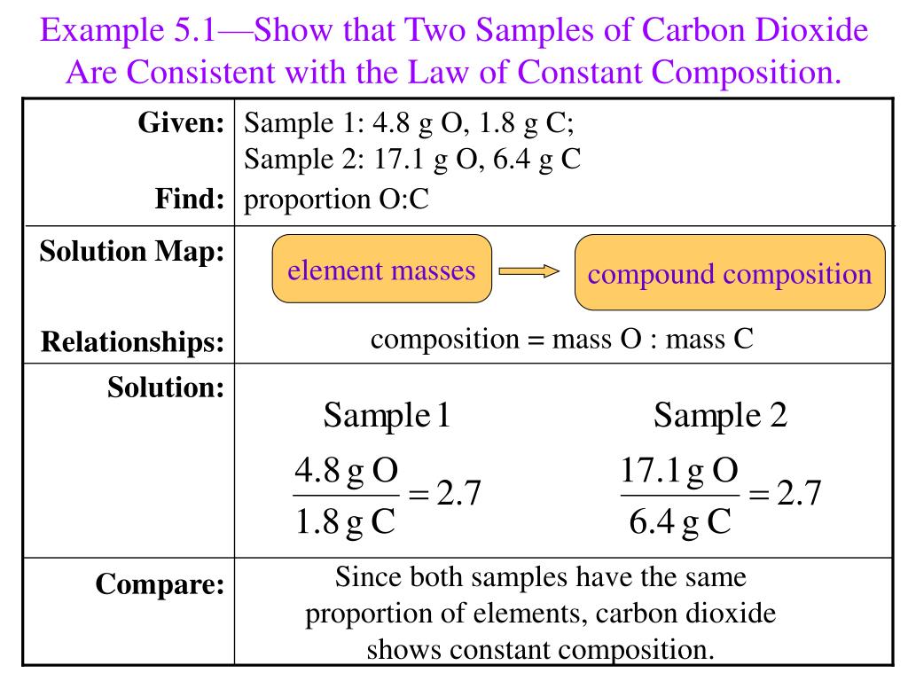 element masses compound composition Example 5.1—Show that Two Samples of Carbon Dioxide Are Consistent with the Law of Constant Composition. Given: Find: Sample 1: 4.8 g O, 1.8 g C; Sample 2: 17.1 g O, 6.4 g C proportion O:C Solution Map: Relationships: composition = mass O : mass C Solution: Since both samples have the same proportion of elements, carbon dioxide shows constant composition. Compare:
