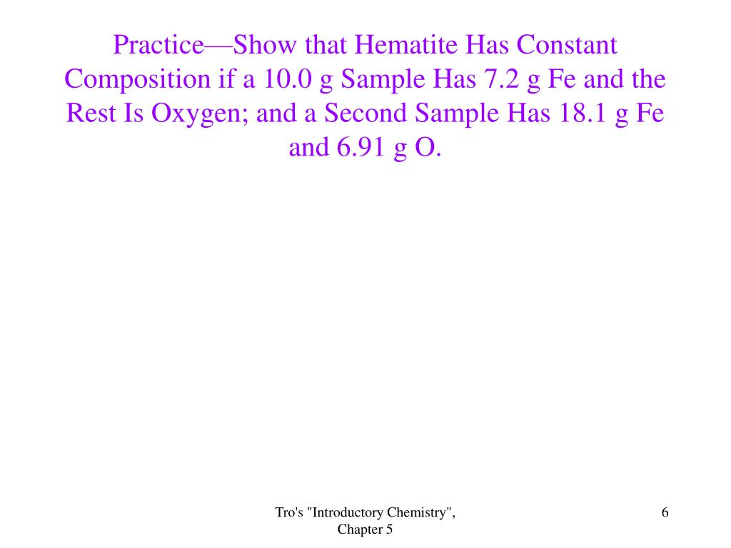 Practice—Show that Hematite Has Constant Composition if a 10.0 g Sample Has 7.2 g Fe and the Rest Is Oxygen; and a Second Sample Has 18.1 g Fe and 6.91 g O. Tro's "Introductory Chemistry", Chapter 5