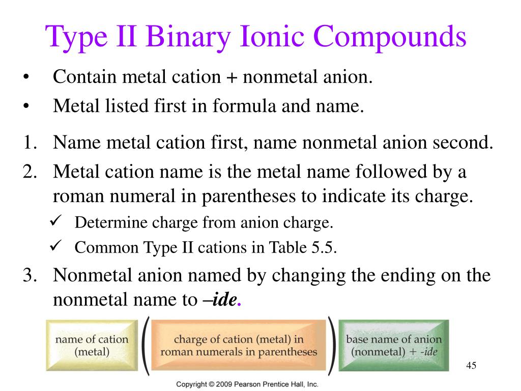 Type II Binary Ionic Compounds • Contain metal cation + nonmetal anion. • Metal listed first in formula and name. • Name metal cation first, name nonmetal anion second. • Metal cation name is the metal name followed by a roman numeral in parentheses to indicate its charge. • Determine charge from anion charge. • Common Type II cations in Table 5.5. • Nonmetal anion named by changing the ending on the nonmetal name to –ide. Tro's "Introductory Chemistry", Chapter 5