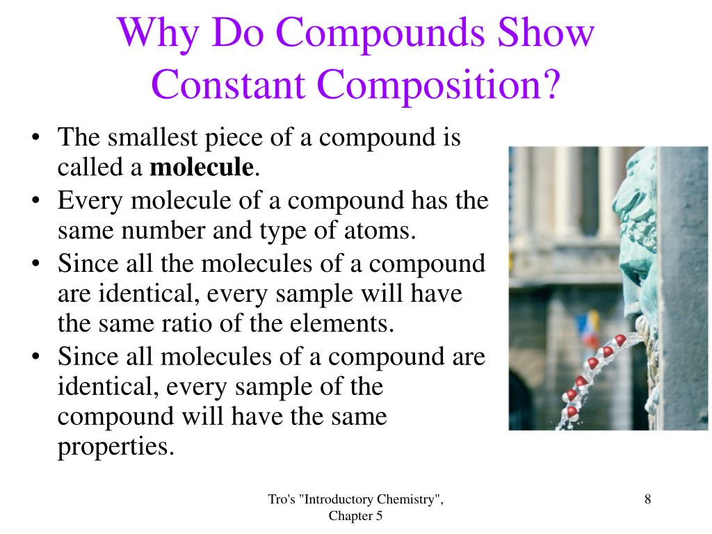Why Do Compounds ShowConstant Composition? • The smallest piece of a compound is called a molecule. • Every molecule of a compound has the same number and type of atoms. • Since all the molecules of a compound are identical, every sample will have the same ratio of the elements. • Since all molecules of a compound are identical, every sample of the compound will have the same properties. Tro's "Introductory Chemistry", Chapter 5