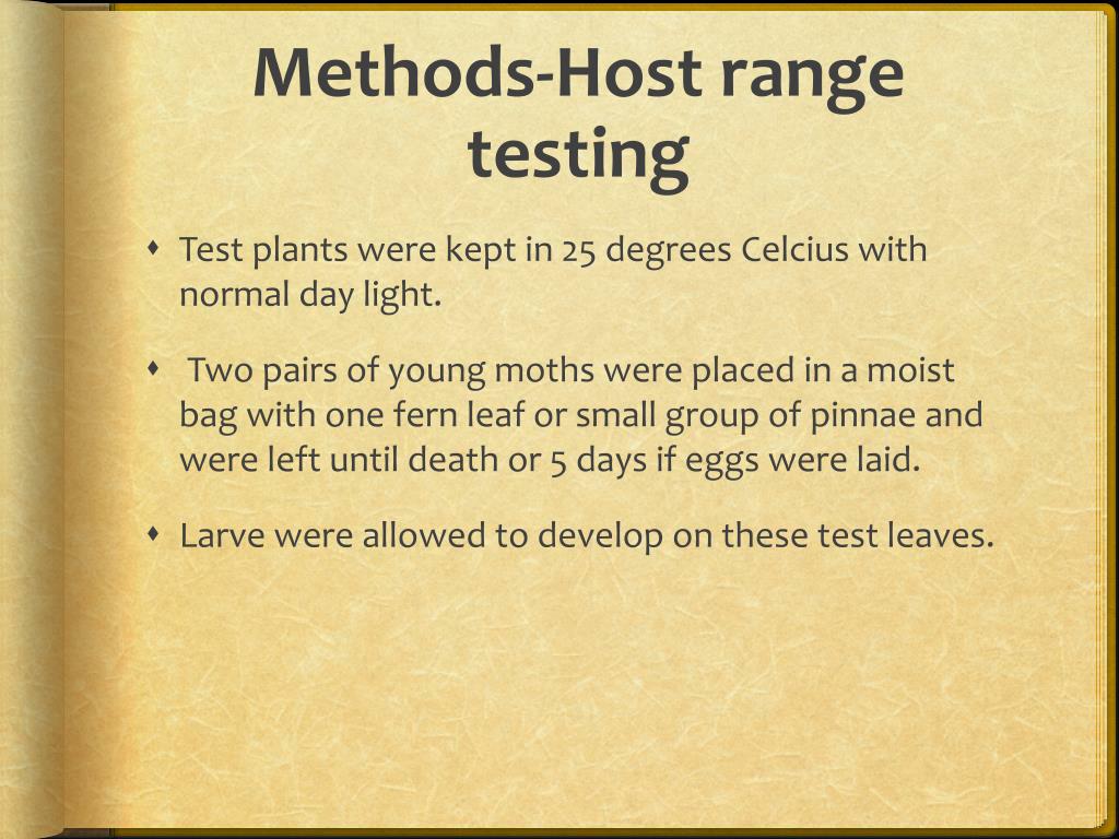 Methods-Host range testing • Test plants were kept in 25 degrees Celcius with normal day light. • Two pairs of young moths were placed in a moist bag with one fern leaf or small group of pinnae and were left until death or 5 days if eggs were laid. • Larve were allowed to develop on these test leaves.