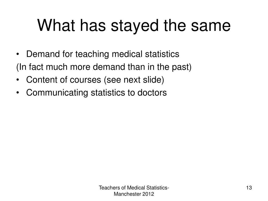 What has stayed the same • Demand for teaching medical statistics (In fact much more demand than in the past) • Content of courses (see next slide) • Communicating statistics to doctors Teachers of Medical Statistics- Manchester 2012
