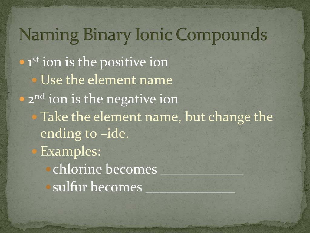 Naming Binary Ionic Compounds • 1st ion is the positive ion • Use the element name • 2nd ion is the negative ion • Take the element name, but change the ending to –ide. • Examples: • chlorine becomes ____________ • sulfur becomes _____________