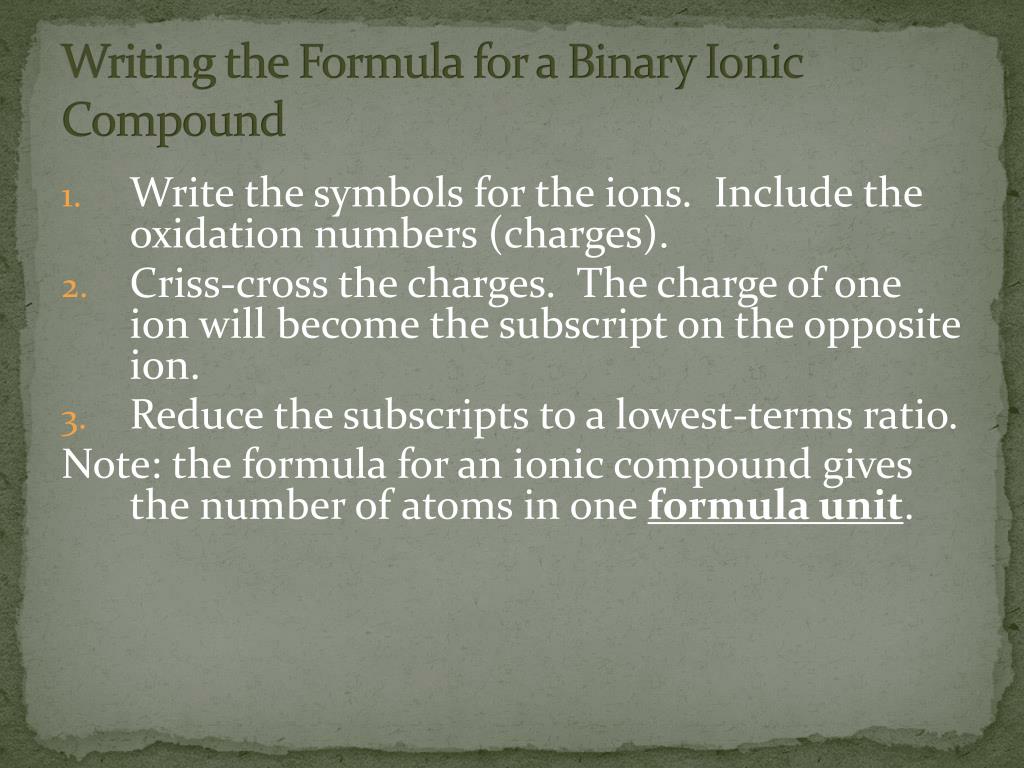 Writing the Formula for a Binary Ionic Compound • Write the symbols for the ions. Include the oxidation numbers (charges). • Criss-cross the charges. The charge of one ion will become the subscript on the opposite ion. • Reduce the subscripts to a lowest-terms ratio. Note: the formula for an ionic compound gives the number of atoms in one formula unit.