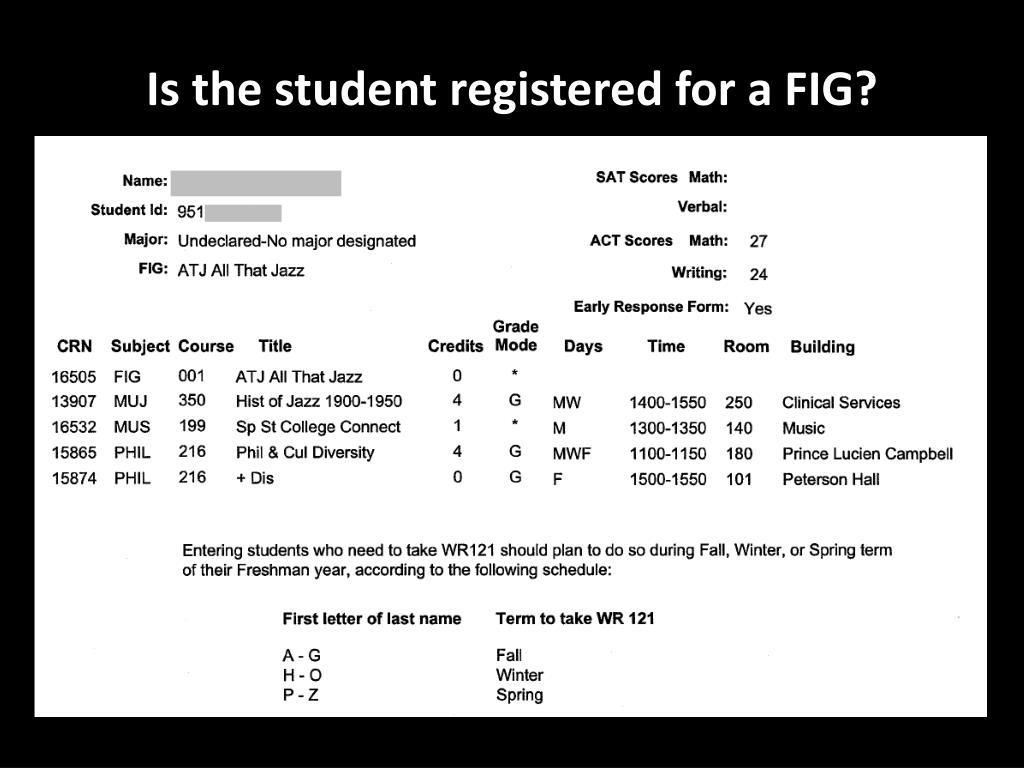 Scenarios • Which course should these students take? When? • Becca Schulze has an SAT score of 700 and no transfer credit. • Andrew Wahlstrom has an ACT score of 32 and no transfer credit. • Lori Manson has an SAT score of 360 and transfer credit from her local community college for WR 121.