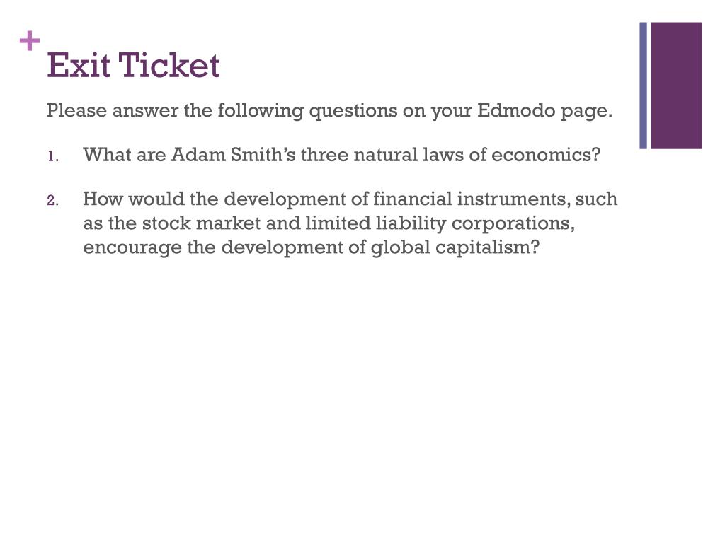 Exit Ticket Please answer the following questions on your Edmodo page. • What are Adam Smith’s three natural laws of economics? • How would the development of financial instruments, such as the stock market and limited liability corporations, encourage the development of global capitalism?