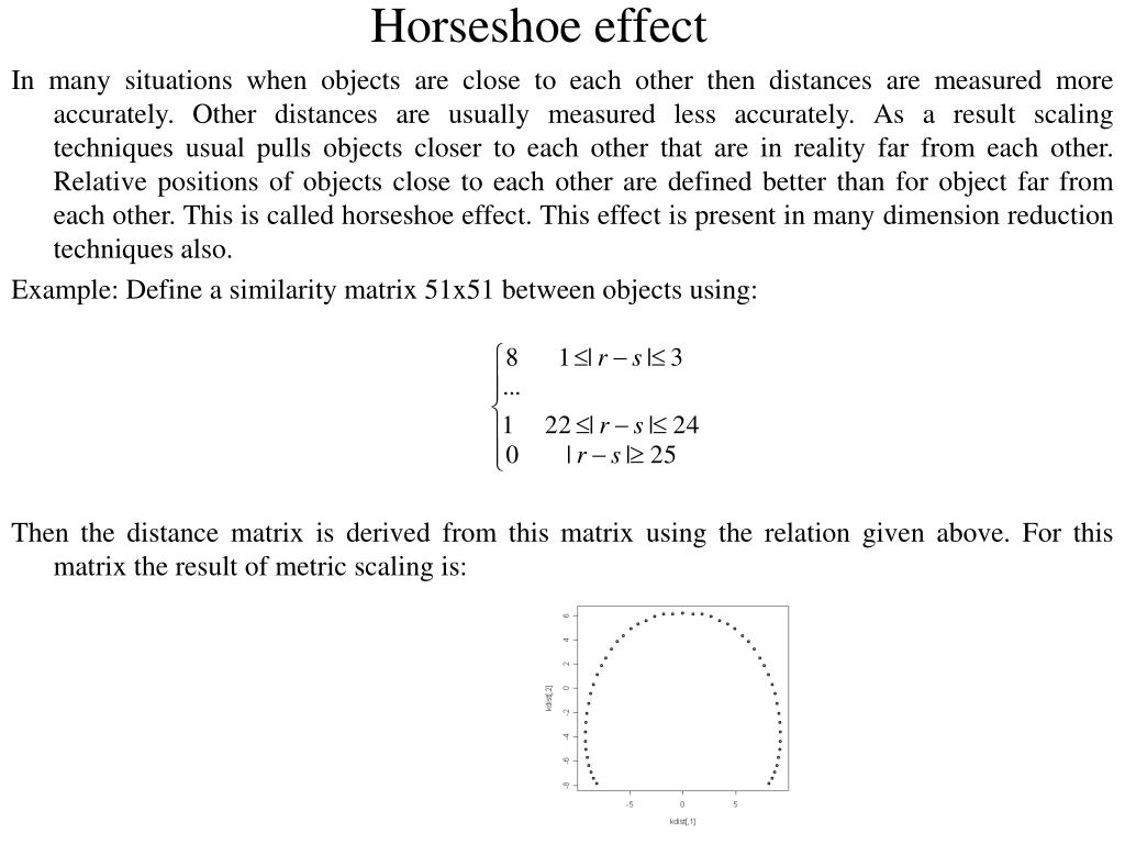 Horseshoe effect In many situations when objects are close to each other then distances are measured more accurately. Other distances are usually measured less accurately. As a result scaling techniques usual pulls objects closer to each other that are in reality far from each other. Relative positions of objects close to each other are defined better than for object far from each other. This is called horseshoe effect. This effect is present in many dimension reduction techniques also. Example: Define a similarity matrix 51x51 between objects using: Then the distance matrix is derived from this matrix using the relation given above. For this matrix the result of metric scaling is: