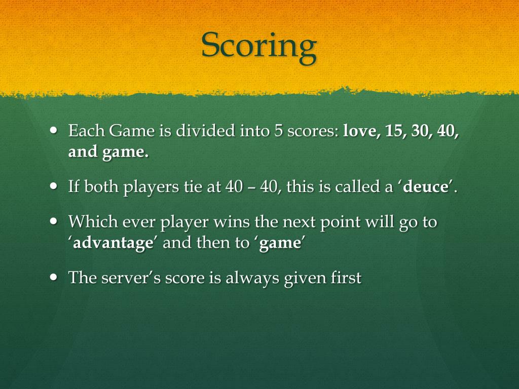 Scoring • Each Game is divided into 5 scores: love, 15, 30, 40, and game. • If both players tie at 40 – 40, this is called a ‘deuce’. • Which ever player wins the next point will go to ‘advantage’ and then to ‘game’ • The server’s score is always given first