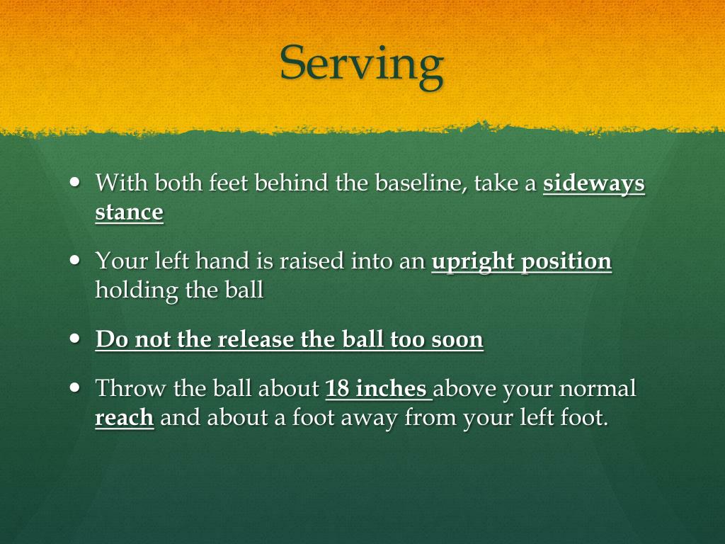 Serving • With both feet behind the baseline, take a sideways stance • Your left hand is raised into an upright position holding the ball • Do not the release the ball too soon • Throw the ball about 18 inches above your normal reach and about a foot away from your left foot.