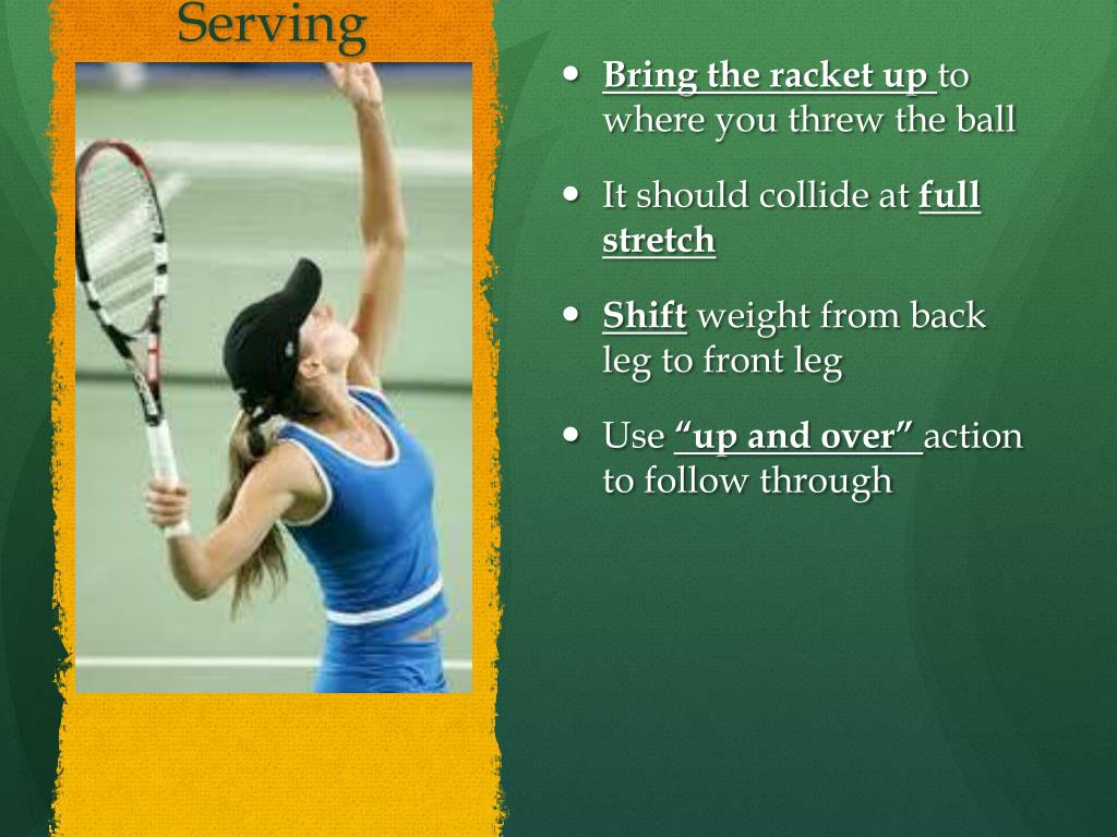Serving • Bring the racket up to where you threw the ball • It should collide at full stretch • Shift weight from back leg to front leg • Use “up and over” action to follow through