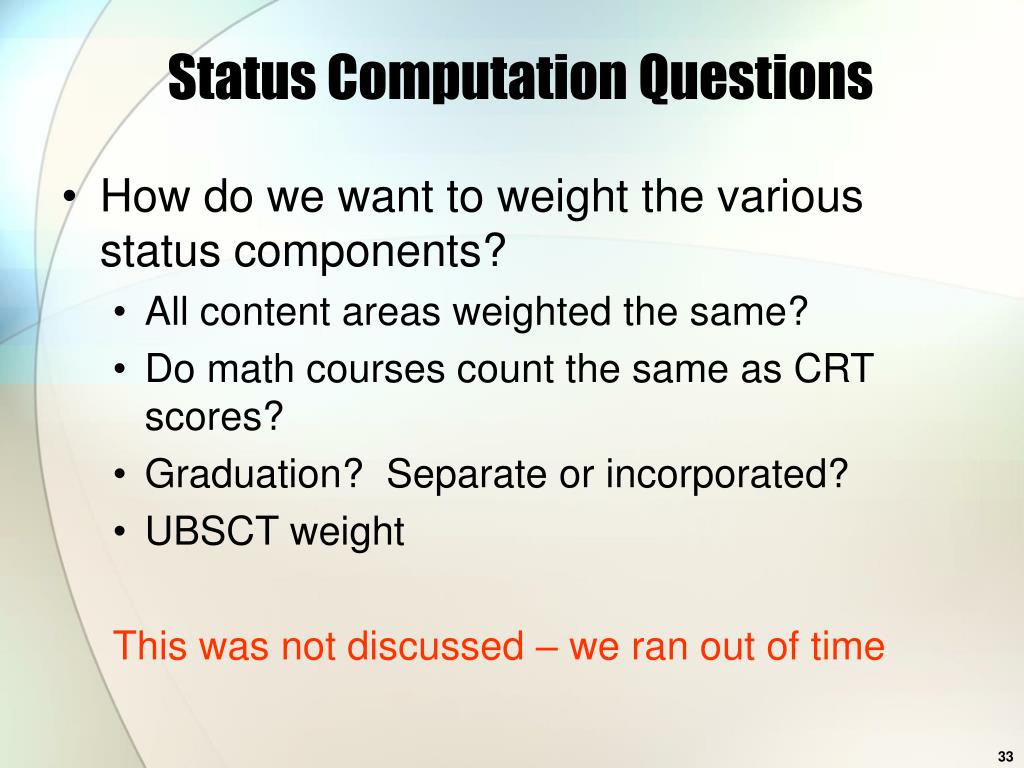 Status Computation Questions • How do we want to weight the various status components? • All content areas weighted the same? • Do math courses count the same as CRT scores? • Graduation? Separate or incorporated? • UBSCT weight This was not discussed – we ran out of time