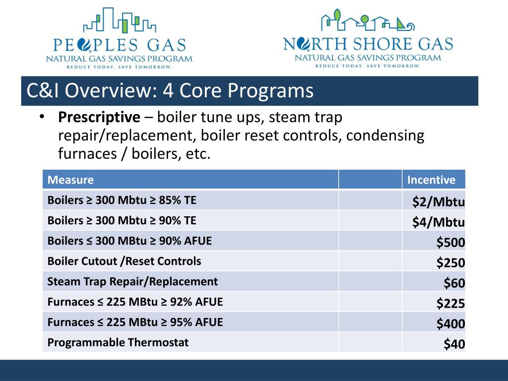 C&I Overview: 4 Core Programs • Prescriptive – boiler tune ups, steam trap repair/replacement, boiler reset controls, condensing furnaces / boilers, etc.