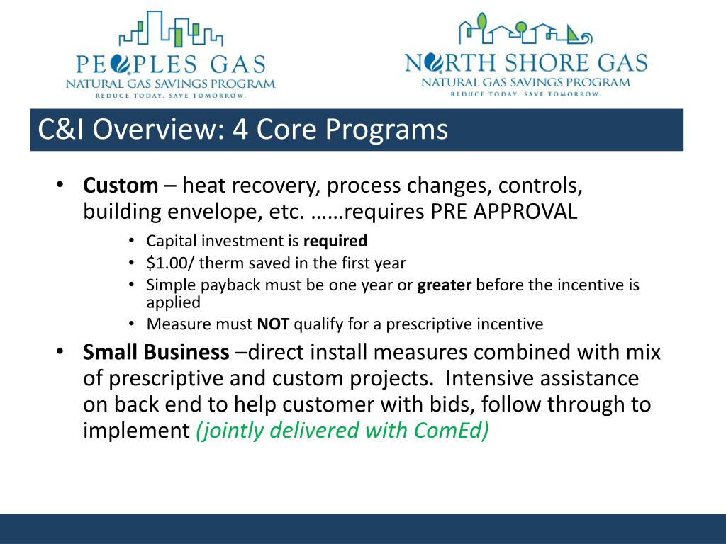 C&I Overview: 4 Core Programs • Custom – heat recovery, process changes, controls, building envelope, etc. ……requires PRE APPROVAL • Capital investment is required • $1.00/ therm saved in the first year • Simple payback must be one year or greater before the incentive is applied • Measure must NOT qualify for a prescriptive incentive • Small Business –direct install measures combined with mix of prescriptive and custom projects. Intensive assistance on back end to help customer with bids, follow through to implement (jointly delivered with ComEd)