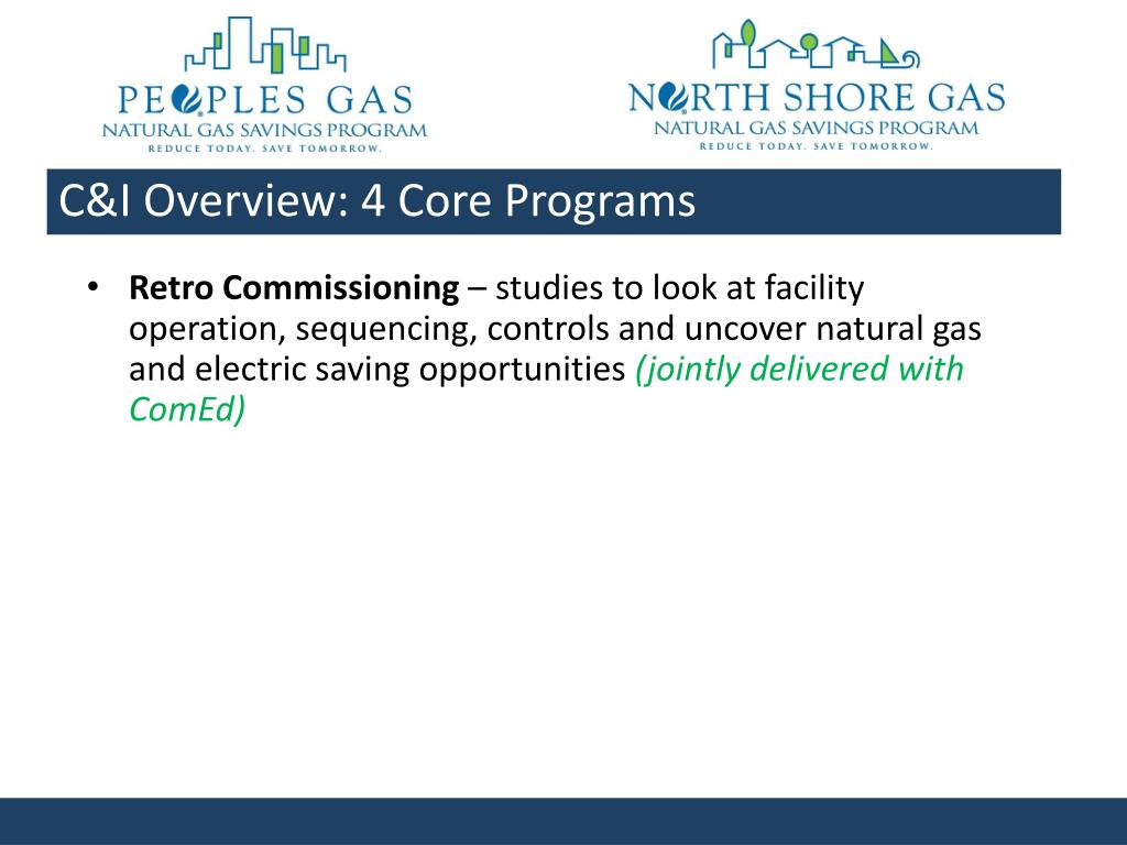 C&I Overview: 4 Core Programs • Retro Commissioning – studies to look at facility operation, sequencing, controls and uncover natural gas and electric saving opportunities (jointly delivered with ComEd)