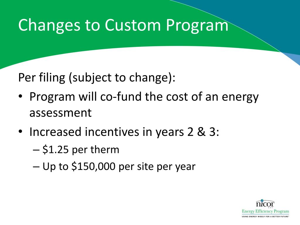 Changes to Custom Program Per filing (subject to change): • Program will co-fund the cost of an energy assessment • Increased incentives in years 2 & 3: • $1.25 per therm • Up to $150,000 per site per year