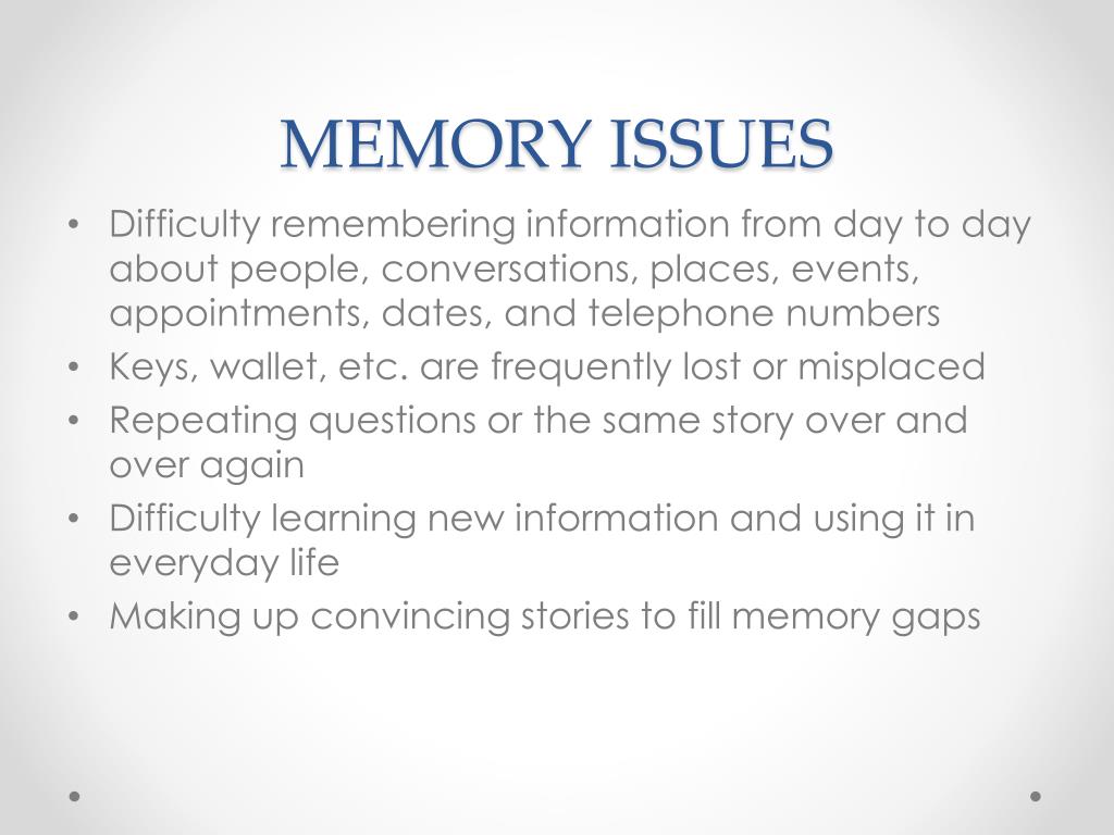 MEMORY ISSUES • Difficulty remembering information from day to day about people, conversations, places, events, appointments, dates, and telephone numbers • Keys, wallet, etc. are frequently lost or misplaced • Repeating questions or the same story over and over again • Difficulty learning new information and using it in everyday life • Making up convincing stories to fill memory gaps