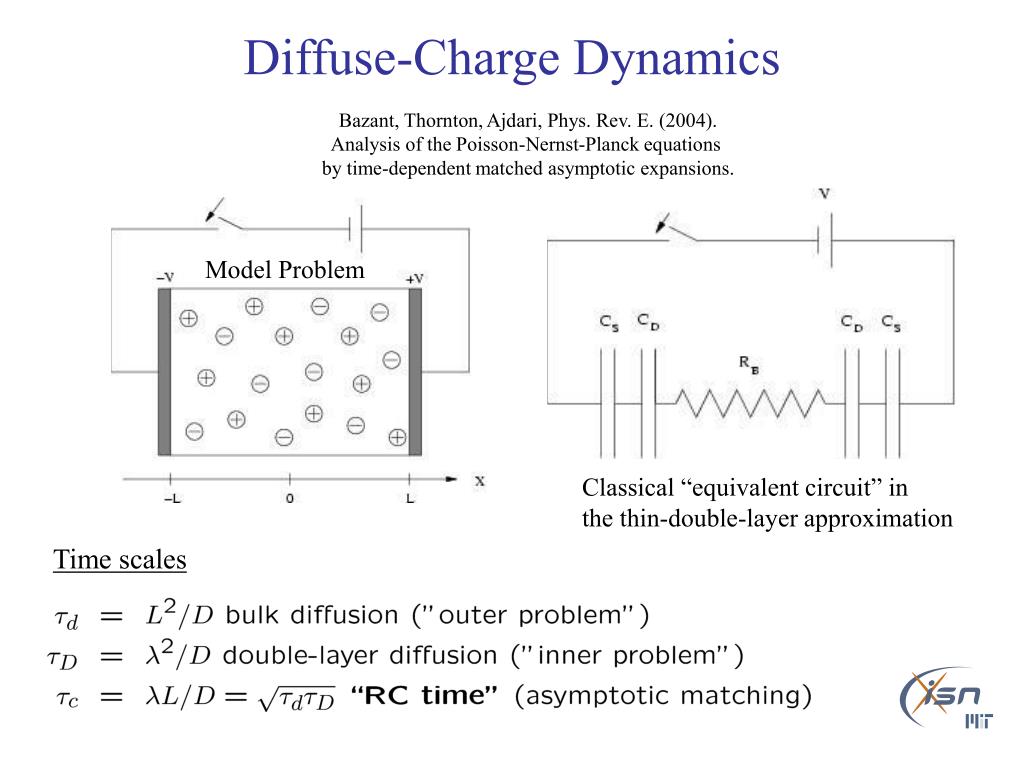 Diffuse-Charge Dynamics Bazant, Thornton, Ajdari, Phys. Rev. E. (2004). Analysis of the Poisson-Nernst-Planck equations by time-dependent matched asymptotic expansions. Model Problem Classical “equivalent circuit” in the thin-double-layer approximation Time scales
