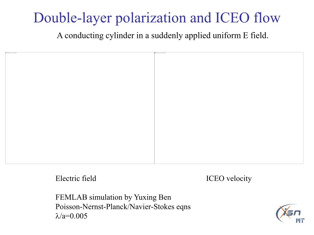 Double-layer polarization and ICEO flow A conducting cylinder in a suddenly applied uniform E field. Electric field ICEO velocity FEMLAB simulation by Yuxing Ben Poisson-Nernst-Planck/Navier-Stokes eqns l/a=0.005