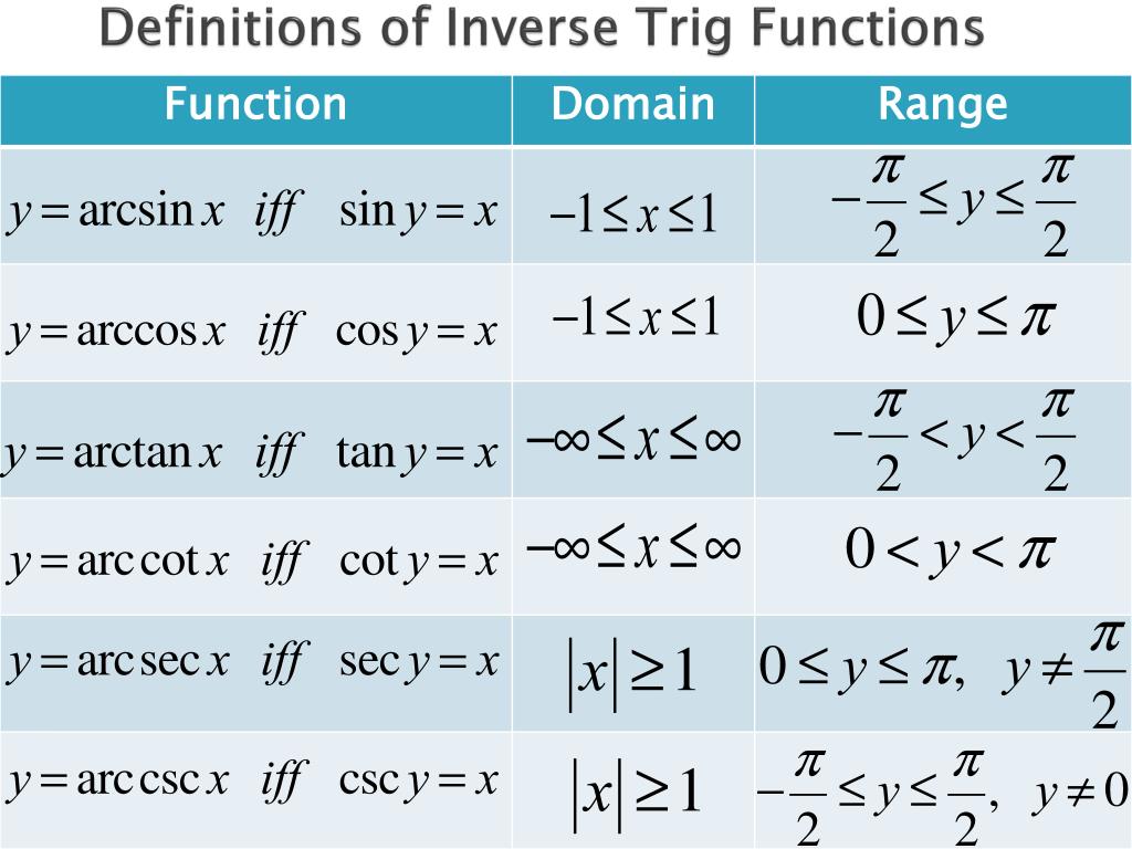 Properties of Inverse Trig Functions If -1 < x < 1 and –π/2 < y < π/2 then sin(arcsinx) = x and arcsin(siny) = y If –π/2 < y < π/2, then tan(arctanx) = x and arctan(tany) = y If |x| > 1 and 0 < y < π/2 or π/2 < y < π, then Sec(arcsecx) = x and arcsec(secy) = y. Similar properties hold for other inverse trig functions.