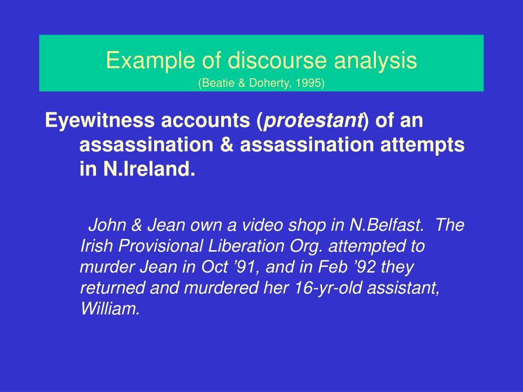 Example of discourse analysis(Beatie & Doherty, 1995) Eyewitness accounts (protestant) of an assassination & assassination attempts in N.Ireland. John & Jean own a video shop in N.Belfast. The Irish Provisional Liberation Org. attempted to murder Jean in Oct ’91, and in Feb ’92 they returned and murdered her 16-yr-old assistant, William.