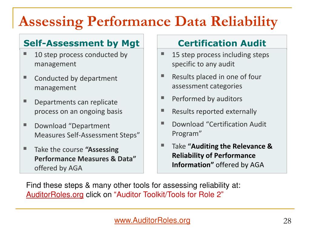 Assessing the Reliability of Performance Measures & Data: Sample Criteria Each Measure and its data should be: AccurateComputed correctly Neither overstated nor understated Appropriately precise ValidCorresponds to the phenomena reported Correctly defined Data & calculation comply with definition Unbiased ConsistentConsistent with previous periods Controlled by adequate systems 27 www.AuditorRoles.org