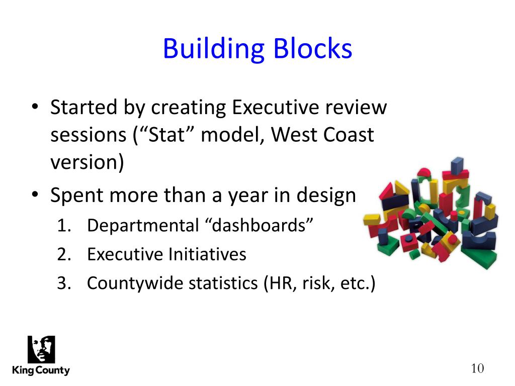 Building Blocks • Started by creating Executive review sessions (“Stat” model, West Coast version) • Spent more than a year in design • Departmental “dashboards” • Executive Initiatives • Countywide statistics (HR, risk, etc.)
