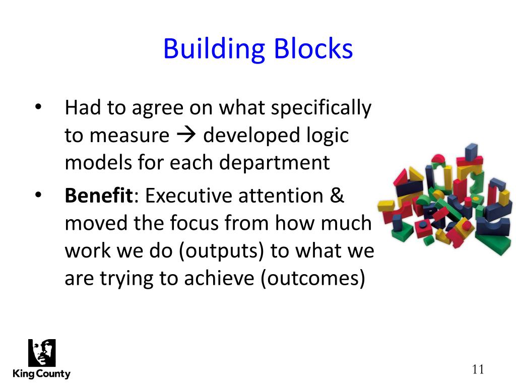 Building Blocks • Had to agree on what specifically to measure developed logic models for each department • Benefit: Executive attention & moved the focus from how much work we do (outputs) to what we are trying to achieve (outcomes)