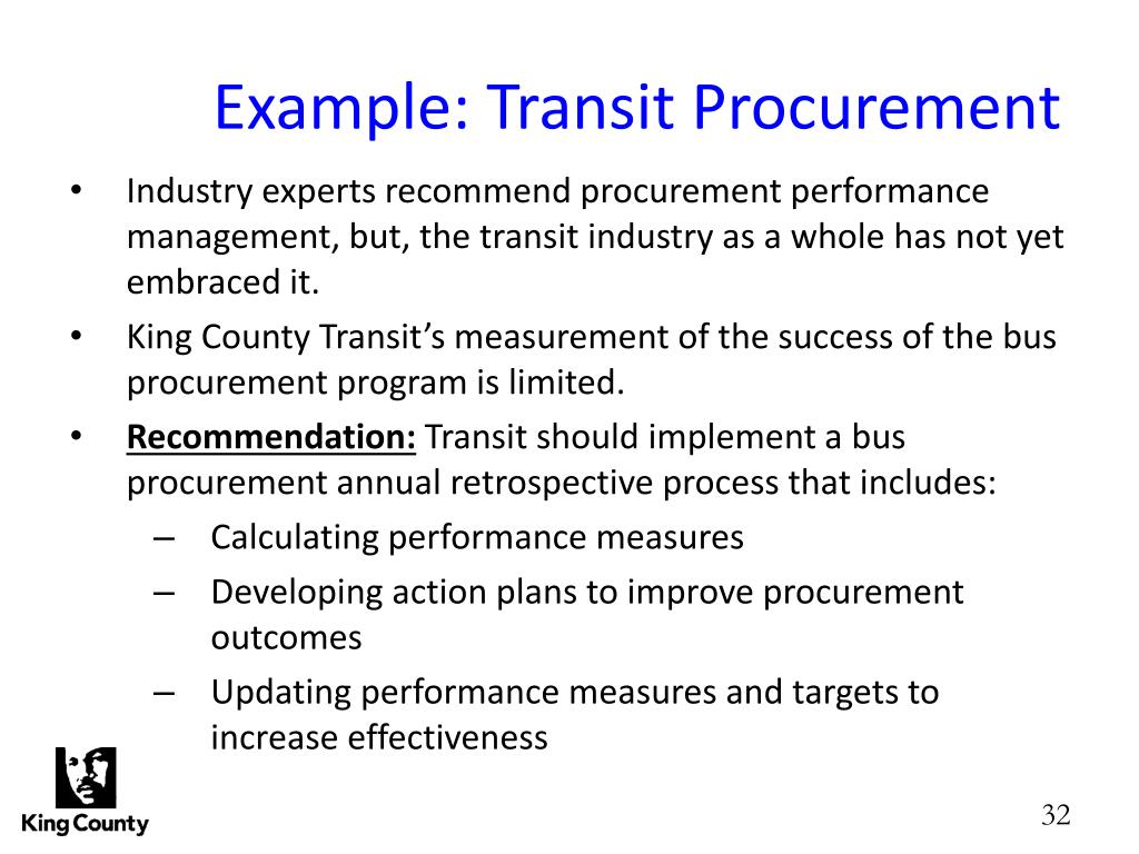 Example: Transit Procurement • Industry experts recommend procurement performance management, but, the transit industry as a whole has not yet embraced it. • King County Transit’s measurement of the success of the bus procurement program is limited. • Recommendation: Transit should implement a bus procurement annual retrospective process that includes: • Calculating performance measures • Developing action plans to improve procurement outcomes • Updating performance measures and targets to increase effectiveness