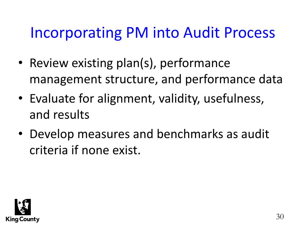 Incorporating PM into Audit Process • Review existing plan(s), performance management structure, and performance data • Evaluate for alignment, validity, usefulness, and results • Develop measures and benchmarks as audit criteria if none exist.