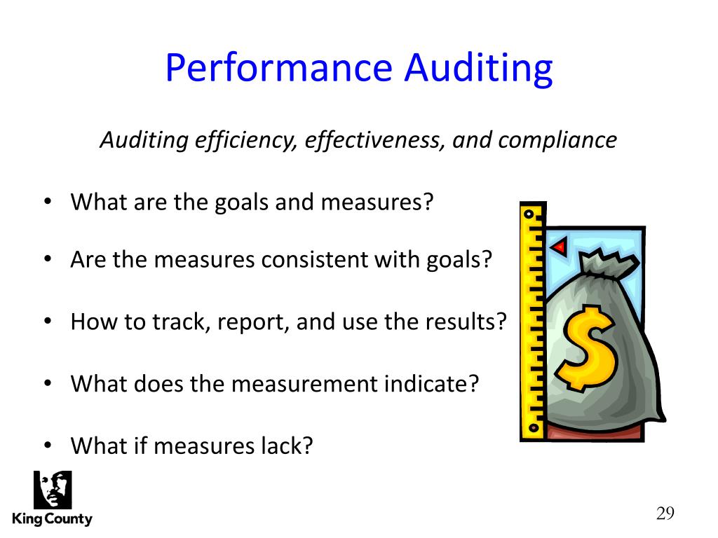 Performance Auditing Auditing efficiency, effectiveness, and compliance • What are the goals and measures? • Are the measures consistent with goals? • How to track, report, and use the results? • What does the measurement indicate? • What if measures lack?