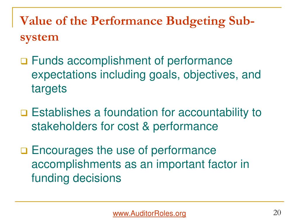 The Performance Budgeting Sub-system Plan Strategic & Annual Planning Act Performance- based Decision Making Do Performance Budgeting & Service Delivery Check Performance Monitoring & Reporting 19 www.AuditorRoles.org