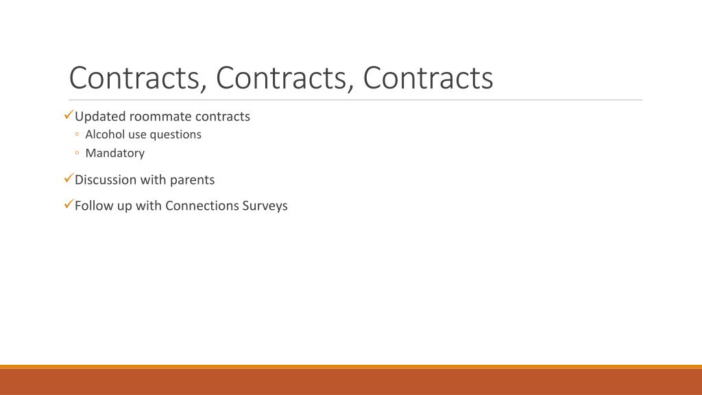 Contracts, Contracts, Contracts • Updated roommate contracts • Alcohol use questions • Mandatory • Discussion with parents • Follow up with Connections Surveys