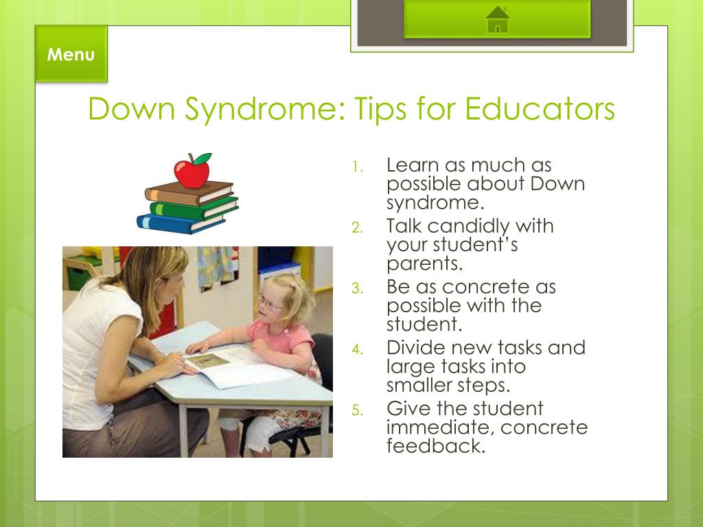 Menu Down Syndrome: Tips for Educators • Learn as much as possible about Down syndrome. • Talk candidly with your student’s parents. • Be as concrete as possible with the student. • Divide new tasks and large tasks into smaller steps. • Give the student immediate, concrete feedback.