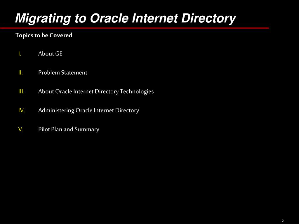 Migrating to Oracle Internet Directory Topics to be Covered • About GE • Problem Statement • About Oracle Internet Directory Technologies • Administering Oracle Internet Directory • Pilot Plan and Summary