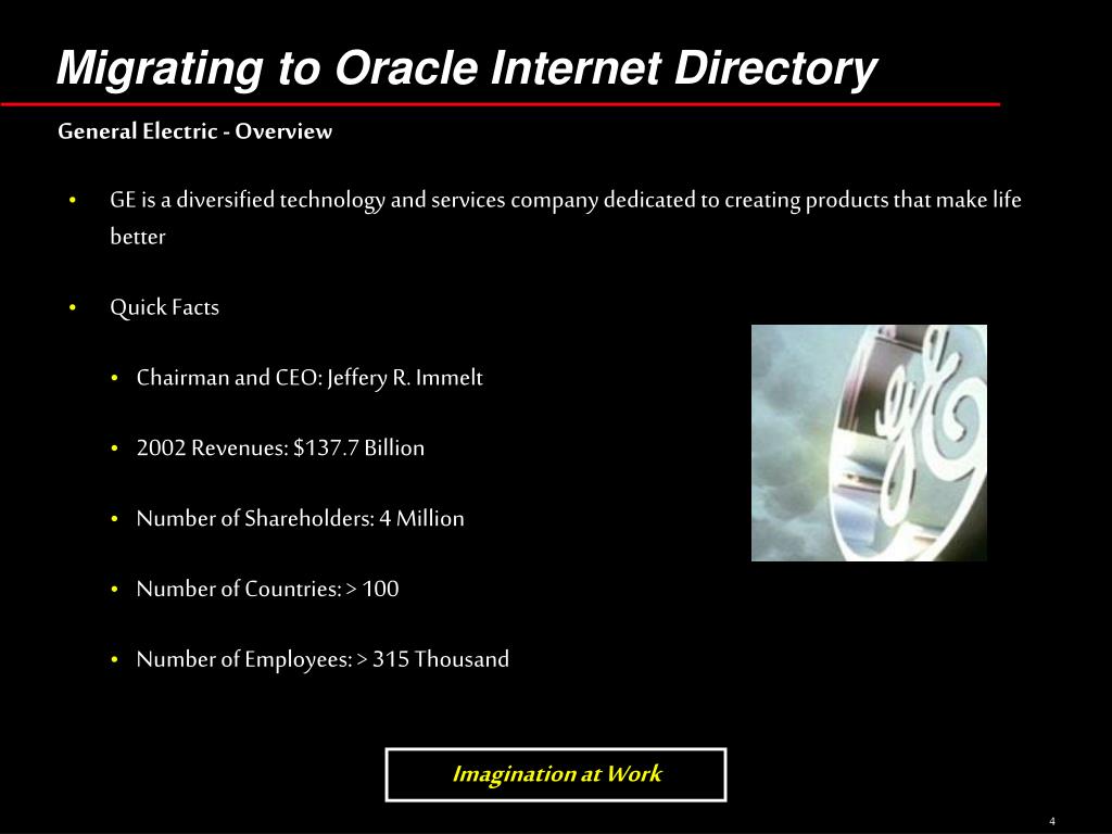 Migrating to Oracle Internet Directory General Electric - Overview • GE is a diversified technology and services company dedicated to creating products that make life better • Quick Facts • Chairman and CEO: Jeffery R. Immelt • 2002 Revenues: $137.7 Billion • Number of Shareholders: 4 Million • Number of Countries: > 100 • Number of Employees: > 315 Thousand Imagination at Work