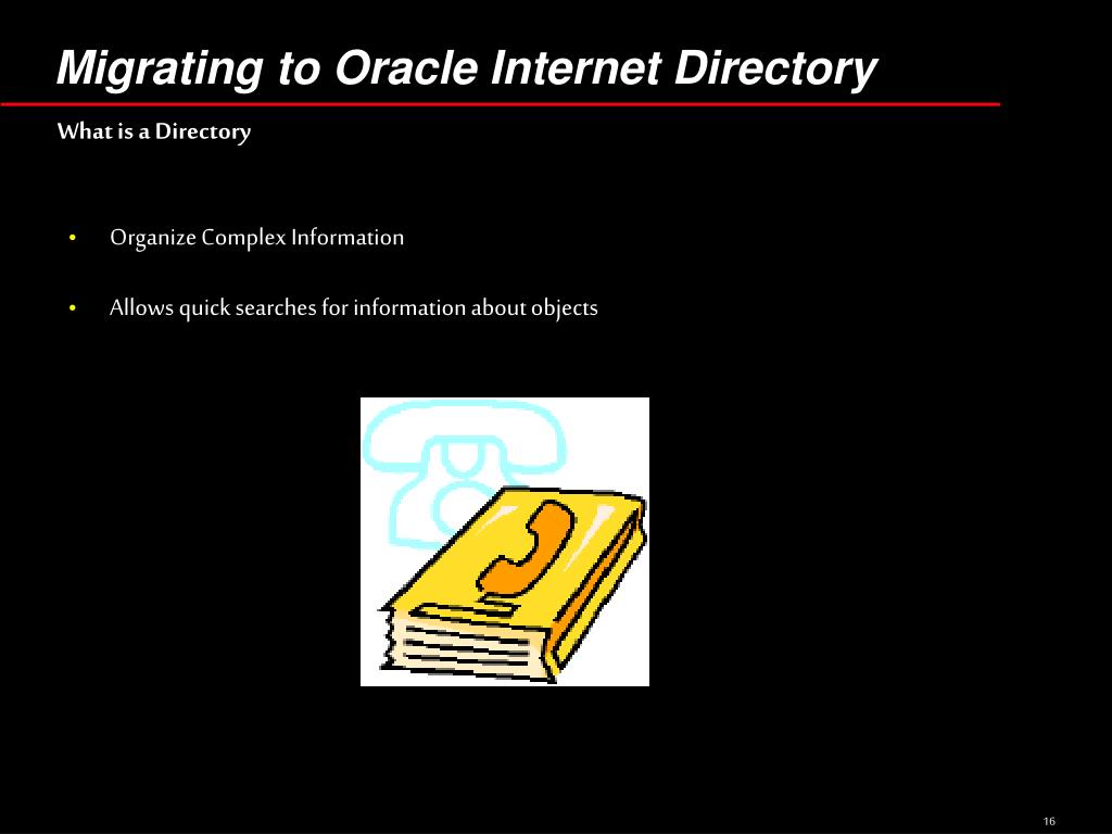 Migrating to Oracle Internet Directory What is a Directory • Organize Complex Information • Allows quick searches for information about objects