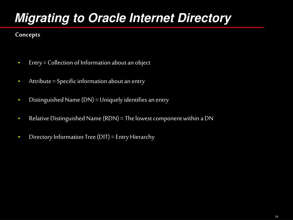 Migrating to Oracle Internet Directory Concepts • Entry = Collection of Information about an object • Attribute = Specific information about an entry • Distinguished Name (DN) = Uniquely identifies an entry • Relative Distinguished Name (RDN) = The lowest component within a DN • Directory Information Tree (DIT) = Entry Hierarchy