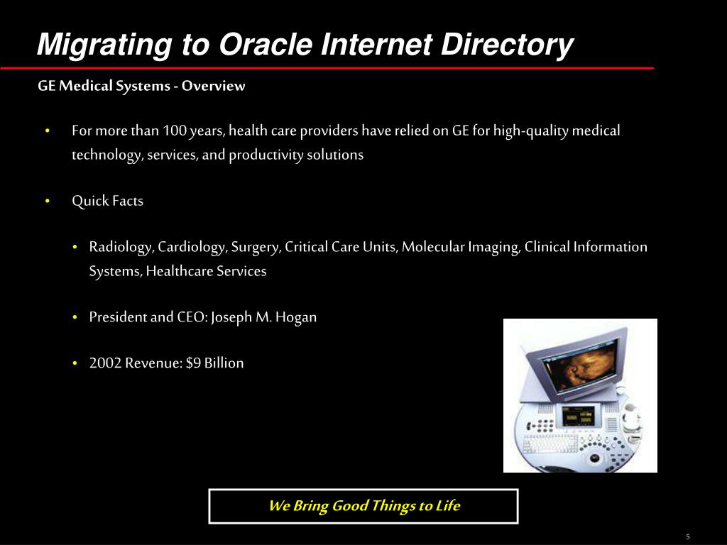 Migrating to Oracle Internet Directory GE Medical Systems - Overview • For more than 100 years, health care providers have relied on GE for high-quality medical technology, services, and productivity solutions • Quick Facts • Radiology, Cardiology, Surgery, Critical Care Units, Molecular Imaging, Clinical Information Systems, Healthcare Services • President and CEO: Joseph M. Hogan • 2002 Revenue: $9 Billion We Bring Good Things to Life