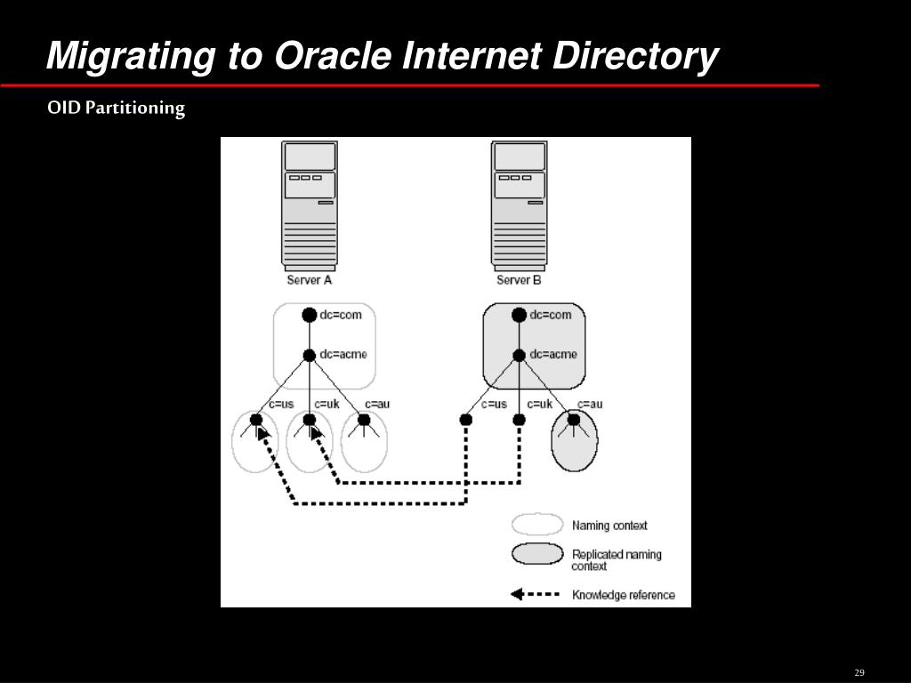 Migrating to Oracle Internet Directory LDAP - Concepts • Naming Context = A subtree of the DIT that resides entirely on one server. Must be contiguous and must extend to leaf.