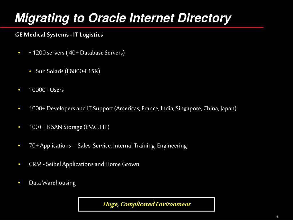 Migrating to Oracle Internet Directory GE Medical Systems - IT Logistics • ~1200 servers ( 40+ Database Servers) • Sun Solaris (E6800-F15K) • 10000+ Users • 1000+ Developers and IT Support (Americas, France, India, Singapore, China, Japan) • 100+ TB SAN Storage (EMC, HP) • 70+ Applications – Sales, Service, Internal Training, Engineering • CRM - Seibel Applications and Home Grown • Data Warehousing Huge, Complicated Environment