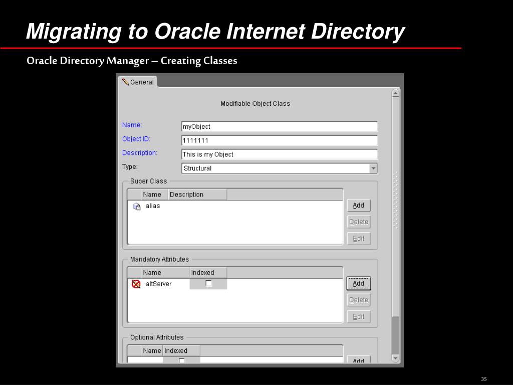 Migrating to Oracle Internet Directory Oracle Directory Manager – Creating Classes (Command Line) Ldapmodify –h myhost –p 389 –f myfile.ldi myfile.ldi dn: cn=subschemasubentry changetype: modify add: objectclasses objectclasses: (1.2.3.4.5 NAME ‘myobjclass’ SUP top STRUCTURAL MUST ( cn $ sn ) MAY ( telephonenumber $ givenname $ myattr ) )