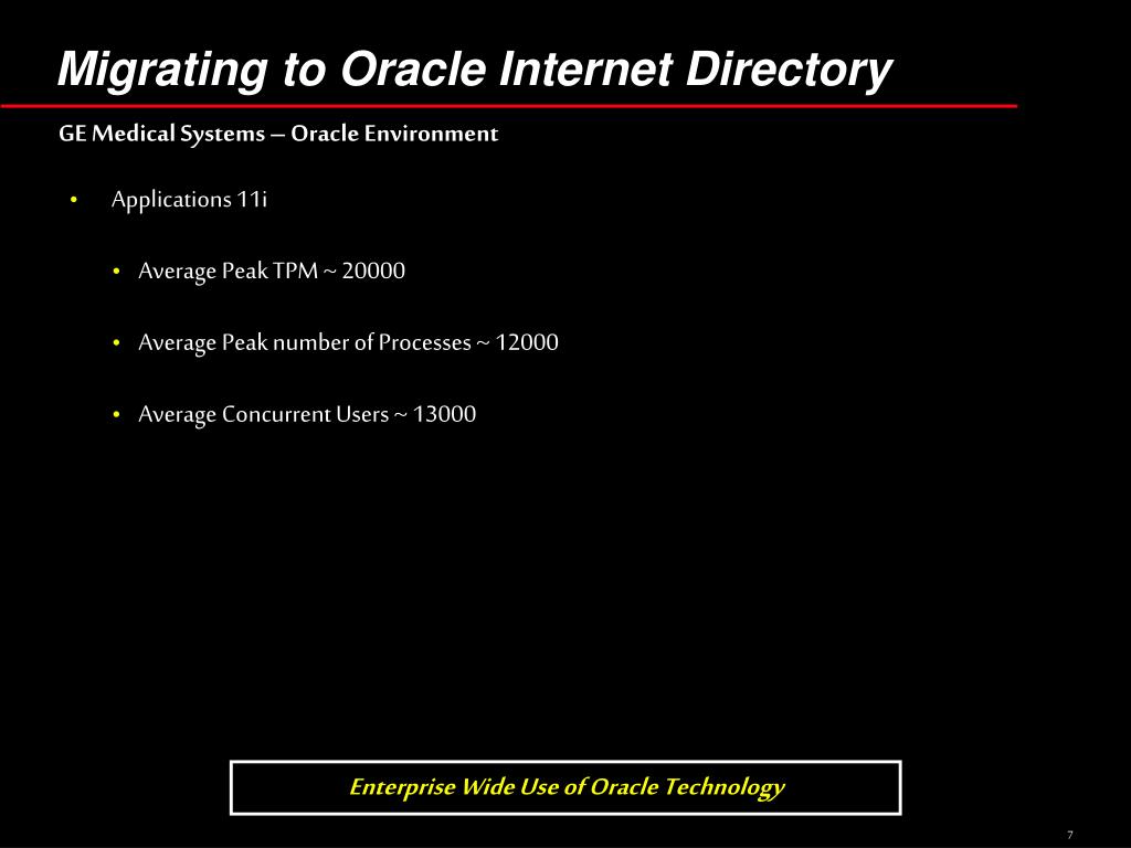 Migrating to Oracle Internet Directory GE Medical Systems – Oracle Environment • Applications 11i • Average Peak TPM ~ 20000 • Average Peak number of Processes ~ 12000 • Average Concurrent Users ~ 13000 Enterprise Wide Use of Oracle Technology
