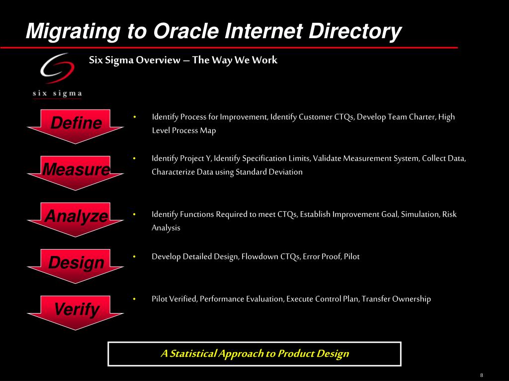 Migrating to Oracle Internet Directory Six Sigma Overview – The Way We Work • Identify Process for Improvement, Identify Customer CTQs, Develop Team Charter, High Level Process Map Define • Identify Project Y, Identify Specification Limits, Validate Measurement System, Collect Data, Characterize Data using Standard Deviation Measure Analyze • Identify Functions Required to meet CTQs, Establish Improvement Goal, Simulation, Risk Analysis An • Develop Detailed Design, Flowdown CTQs, Error Proof, Pilot Design • Pilot Verified, Performance Evaluation, Execute Control Plan, Transfer Ownership Verify A Statistical Approach to Product Design
