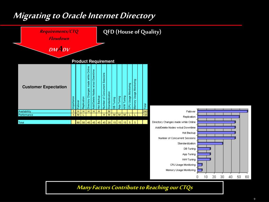 Requirements/CTQ Flowdown DMADV Migrating to Oracle Internet Directory QFD (House of Quality) Many Factors Contribute to Reaching our CTQs