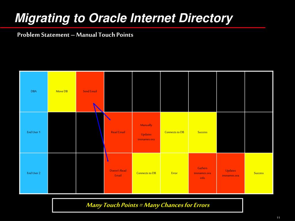 Migrating to Oracle Internet Directory Problem Statement – Manual Touch Points Many Touch Points = Many Chances for Errors
