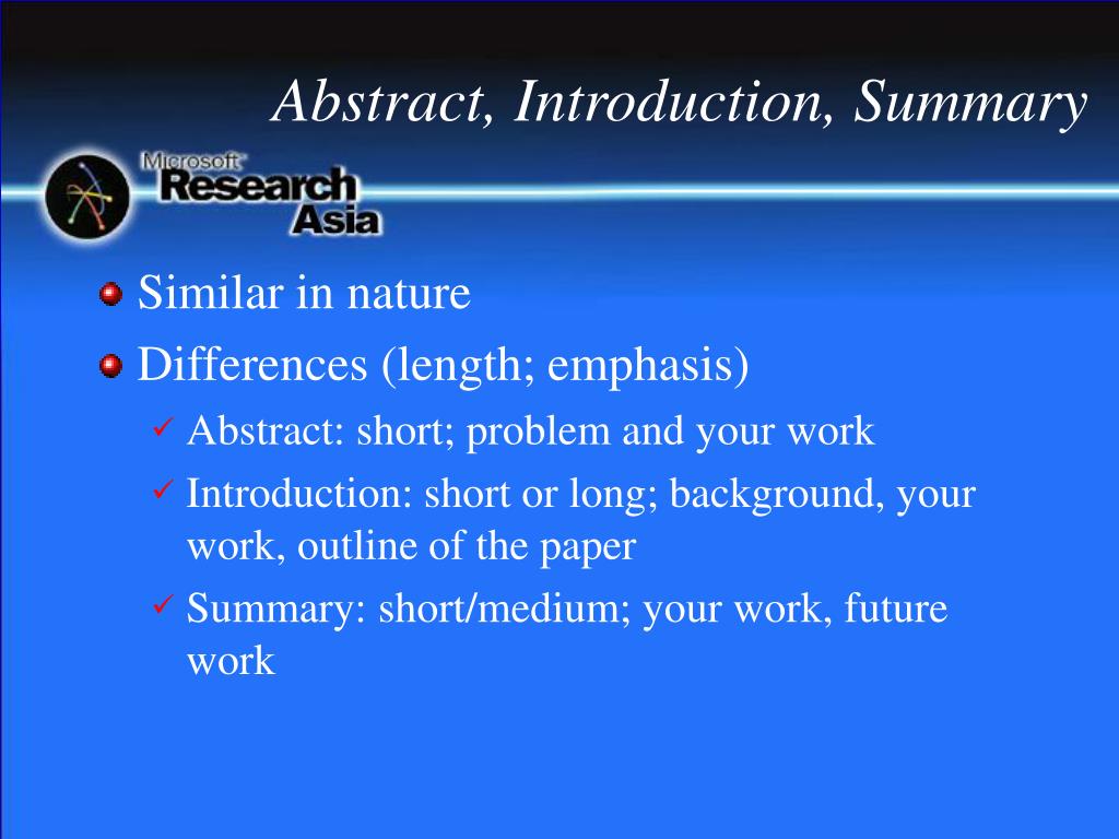 Abstract, Introduction, Summary • Similar in nature • Differences (length; emphasis) • Abstract: short; problem and your work • Introduction: short or long; background, your work, outline of the paper • Summary: short/medium; your work, future work