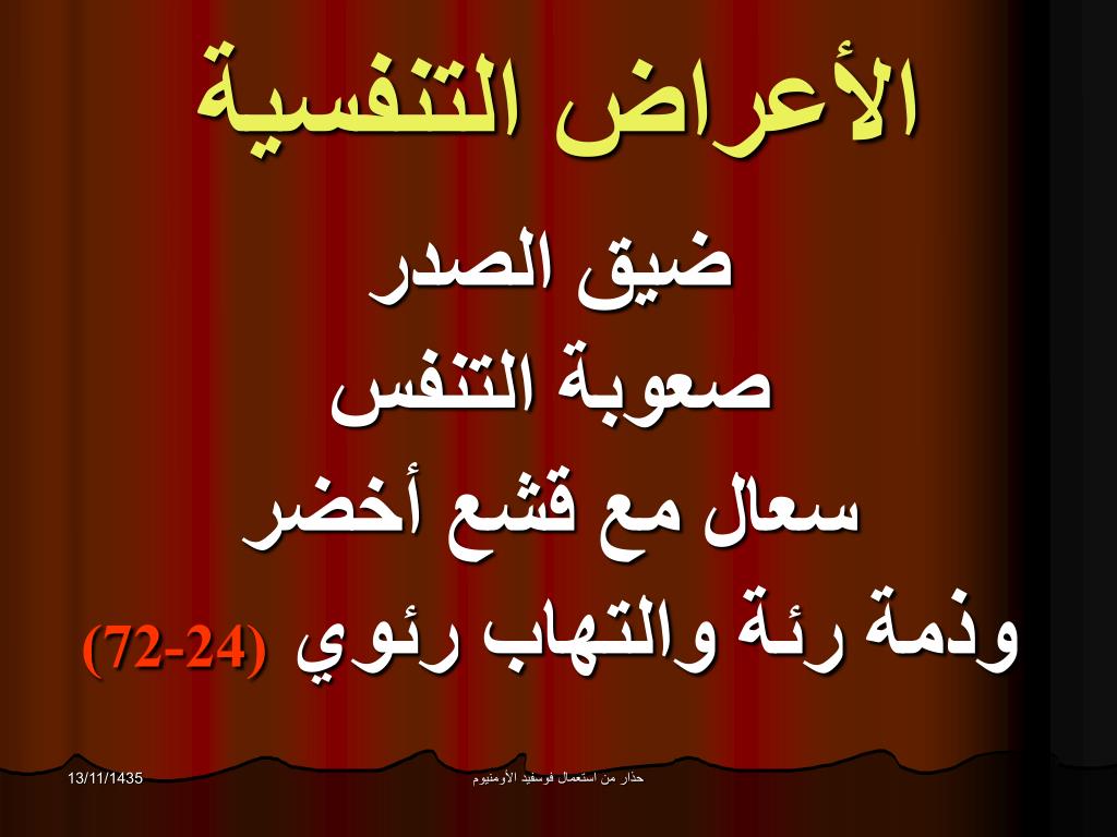 الأعراض التنفسية ضيق الصدر صعوبة التنفس سعال مع قشع أخضر وذمة رئة والتهاب رئوي (24-72) حذار من استعمال فوسفيد الأومنيوم